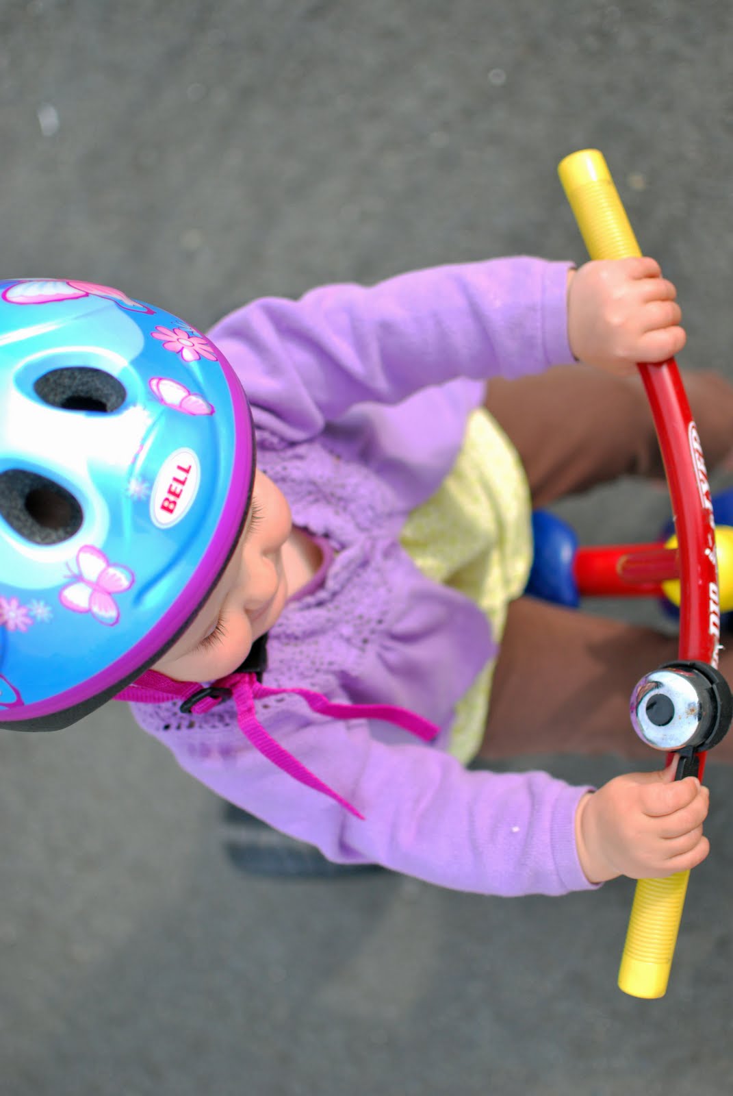 Well, she might have thought pushing the bike was more fun than sitting on it, but she did tolerate the helmet (after some initial protest) and got the hang of the bell pretty quick!